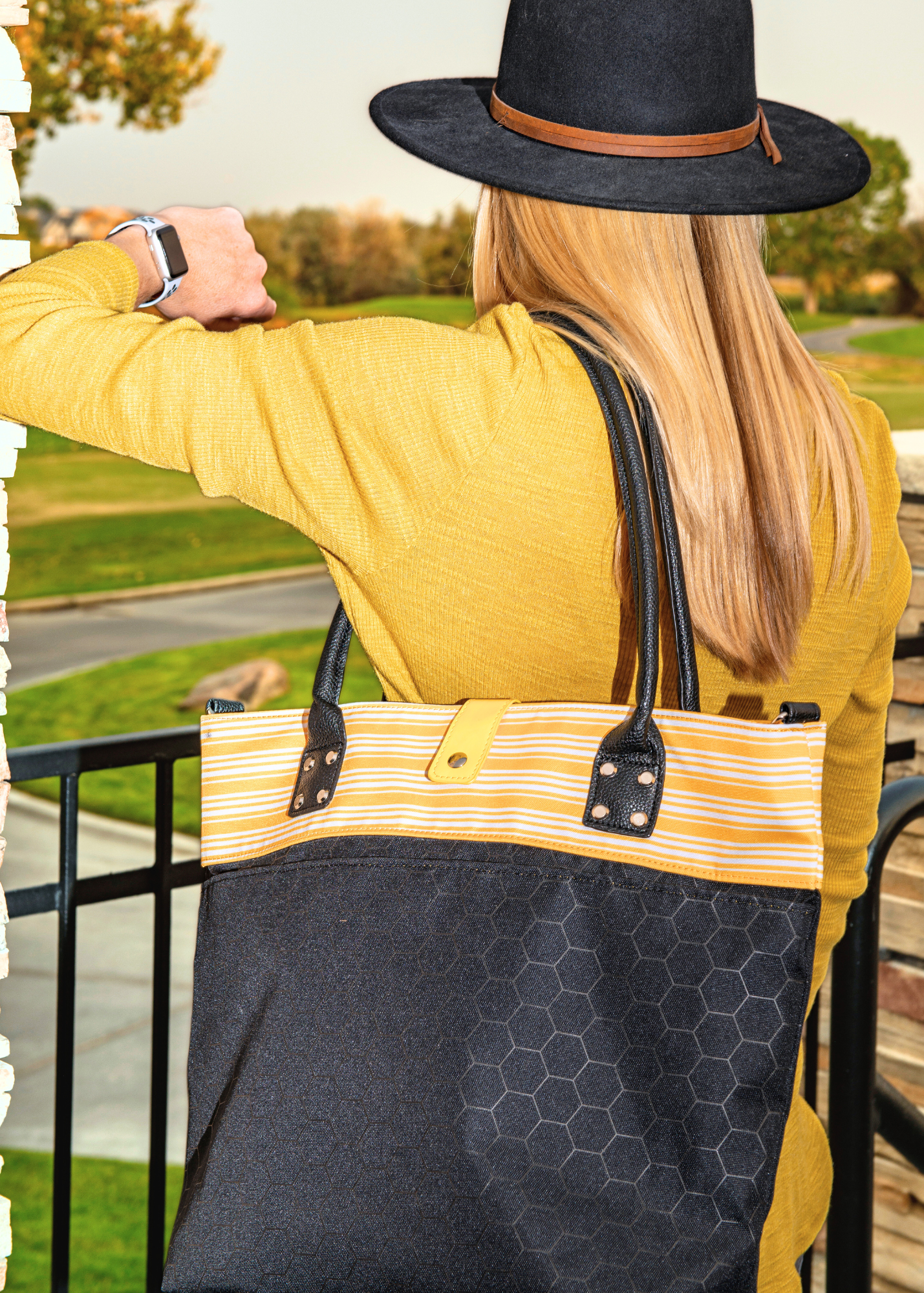 Elevate your everyday carry with the Adelaide Tote Bag—where chic design meets lasting durability. Crafted from attractive, waterproof, stain- and fade-resistant fabric, it’s built to go the distance. Reinforced, rip-resistant leather handles offer comfortable carrying, while the optional snap closure secures your essentials on the move. Two spacious internal side pockets—one with Velcro—keep you organized, and a durable leather bottom protects against wear and stains. Sized for versatility at 23″ L × 10″ W × 17″ H, the Adelaide Tote is your go-to for travel, golf, or daily adventures.