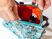 No need to carry your purse onto the golf course! This cross-body bag is perfectly sized for storing your phone, keys, toiletries and more. There are slots for holding tees and a sharpie for scoring your scorecard. A magnetic back flap safely stores your scorecard as you walk into the clubhouse. Clip it back onto your bag so you’re ready to go for your next round!